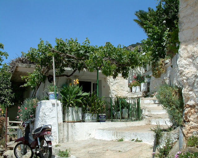 Der erste Eindruck - überall Blumen, Blütenpracht, Büsche und Schatten spendende Bäume - liebevoll gepflegt. Paleochóra liegt auf einer ganz vom Wasser umgebenen Halbinsel. Gleich dahinter stürzen schroffe Felshänge steil herab.